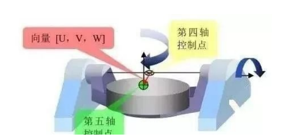 数控系统为了实现五轴控制,需要知道第5轴控制点与第四轴控制点之间的关系。即初始状态(机床A、 C轴0位置),第四轴控制点为原点的第四轴旋转坐标系下,第五轴控制点的位置向量[U,V,W]。同时还需要知道A、C轴轴线之间的距离。对于双转台机床,举例如下图所示。